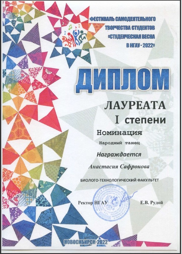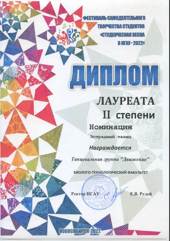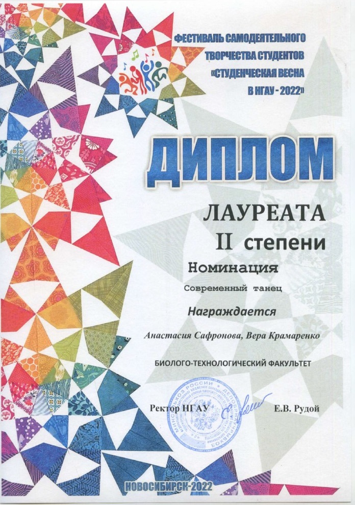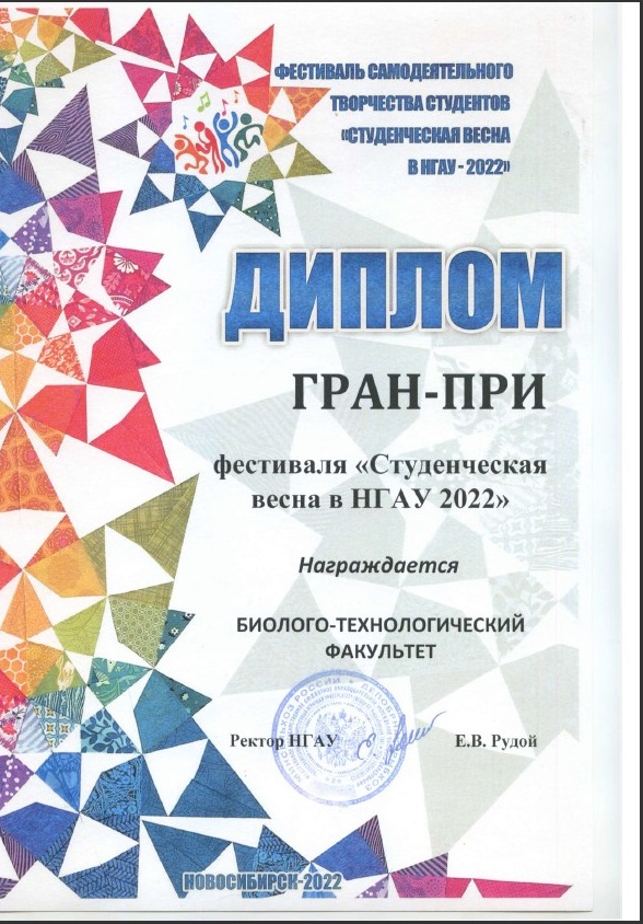 По итогам всех номинаций Биолого-технологический награжден ДИПЛОМОМ ГРАН-ПРИ фестиваля "Студенческая весна в НГАУ 2022".