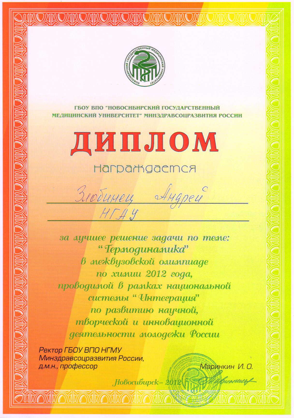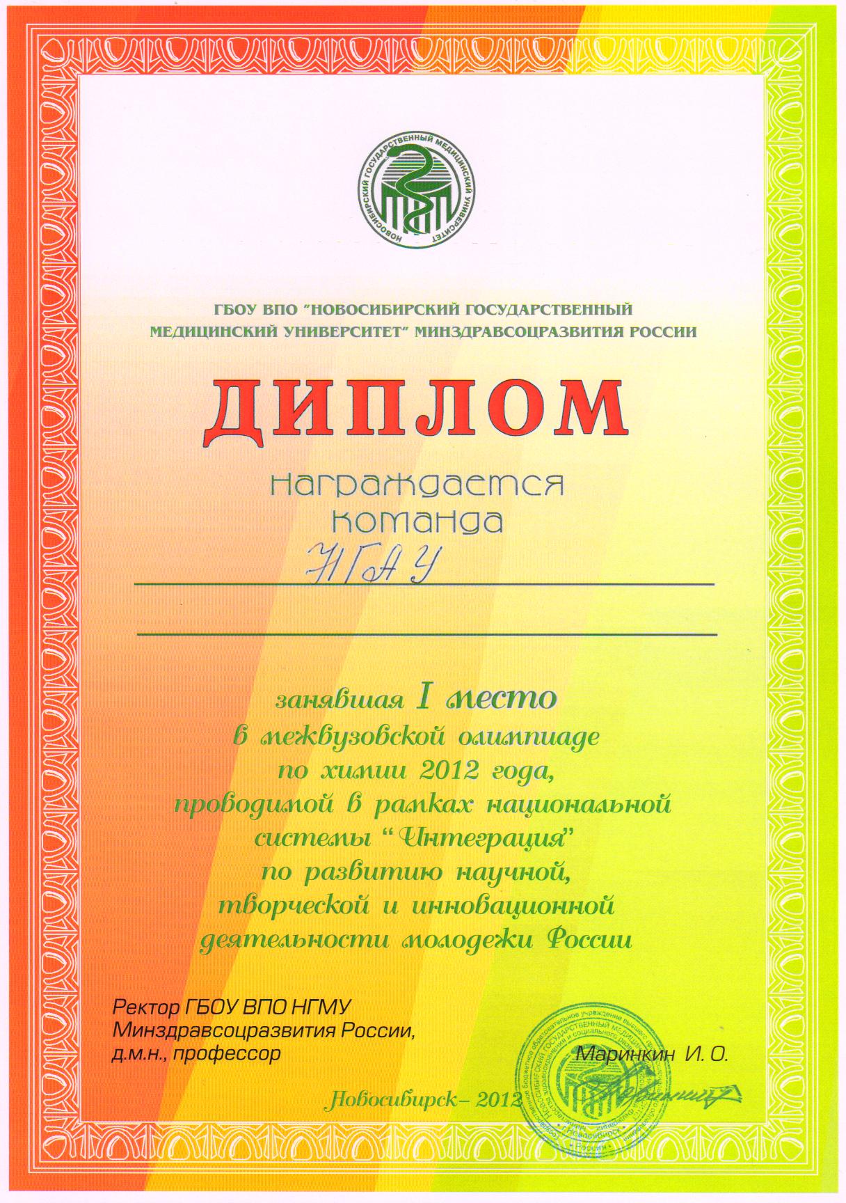 25 апреля 2012 года в Новосибирском государственном медицинском университете состоялась олимпиада по химии среди студентов городских вузов проводимой в рамках национальной системы "Интеграция" по развитию научной, творческой, и инновационной деятельности молодежи России.