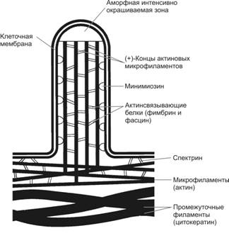 клеточной мембраной. Микрофиламенты микроворсинок соединены с микрофиламентами,