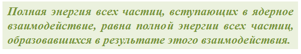 Таким образом, в ядерной физике появляется новый способ измерения энергии. И это очень важно, потому что иногда этот способ является единственно возможным. В соответствии с этим закон сохранения энергии в ядерной физике формулируется следующим образом:
