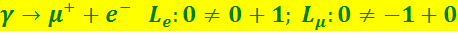 Процесс γ → μ+ + e- противоречит двум законам сохранения лептонных зарядов, поэтому также невозможен: (9.6.30)