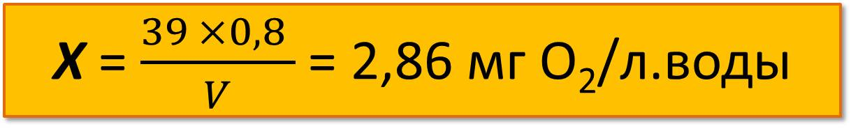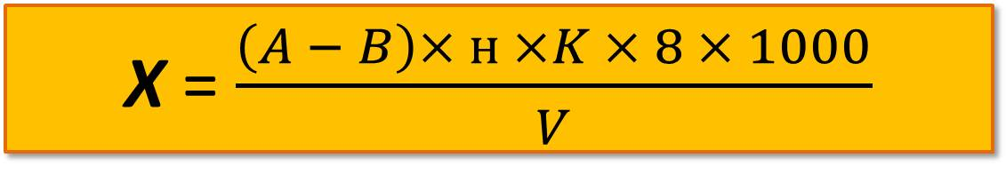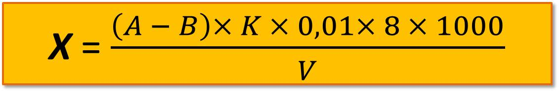 где А – количество 0,01 н. раствора перманганата калия на титрование пробы, мл; В – количество 0,01 н. раствора перманганата калия на титрование холостой пробы, мл; К – поправочный коэффициент для раствора перманганата калия (К =1); V – объем пробы, взятой для анализа, мл; 8 – эквивалент кислорода.