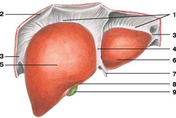 1 - венечная связка печени;2 - диафрагма;3 - треугольная связка печени;4 - серповидная связка печени;5 - правая доля печени;6 - левая доля печени;7 - круглая связка печени;8 - острый нижний край;9 - желчный пузырь