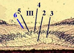 клетки 1. У рецепторных клеток ядерные части (1) находятся в средней части эпителия. (В этом - ещё одно отличие: в обычном мерцательном эпителии реснитчатые клетки образуют верхний слой ядер). 2. а) Вверх отходят дендриты (2),