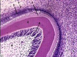 формирующейся пульпы зуба (6) и мезенхима (7), окружающая зубной зачаток. |