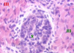 а) Под лимфатическими узелками находится подслизистая основа (8).