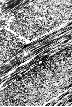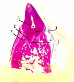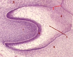 гистогенеза зуба. Разрез челюсти зародыша. Окраска гематоксилин-эозином. 1. Здесь мы видим под большим увеличением верхнюю часть коронки формирующегося зуба. 2. В поле зрения - следующие структуры. |