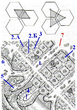 | в) А. В центре дольки синусоидные капилляры впадают в центральную вену (8), которая проходит по оси дольки. | |