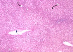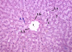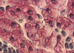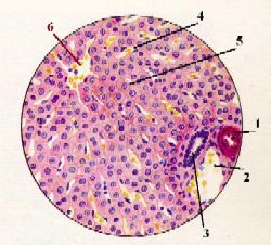 частности, различимы печёночные балки (2) и синусоидные капилляры (3), 2. Печёночные балки включают чаще всего 2 ряда клеток. |