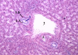 4. а) Синусоидные капилляры впадают в центральную вену (1). б) Последняя -