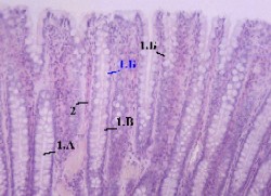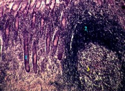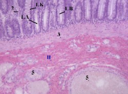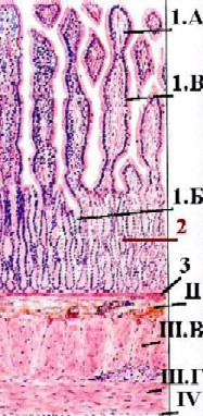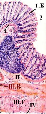большем увеличении представлены крипты (1.А). а) А. В выстилающем их эпителии преобладают слизеобразующие бокаловидные клетки (1.Б) - светлые и округлые. Б. Поэтому данные крипты с гораздо большим основанием (чем крипты тонкого кишечника) можно называть железами. б) Среди остальных клеток эпителия (с тёмной цитоплазмой) основную массу составляют столбчатые клетки (1.В). 2. Узкие прослойки соединительной ткани между криптами образуют, как мы знаем, собственную пластинку (2) слизистой оболочки. 3. Ещё глубже располагаются