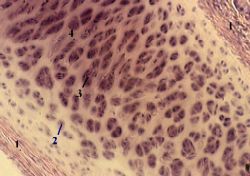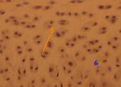 к гиалиновому хрящу. а) В его поверхностных слоях (прилегающих к надхрящнице (2 на снимке е)) клетки представлены молодыми хондроцитами (3), которые