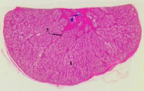 в) В крупных выводных протоках эпителий - многорядный. 4. а) Заметим: в простате человека протоки имеют более широкий просвет, чем концевые отделы. б) У собаки же (как видно на снимках) протоки очень узкие. |