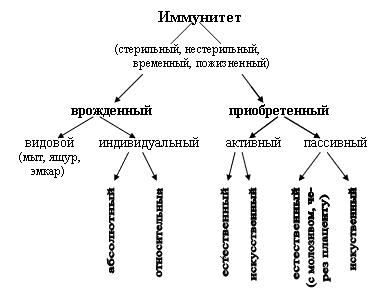 Причины и условия иммуногенеза не всегда аналогичны, и в зависимости от этого иммунитет подразделяют на врожденный и приобретенный, относительный, активный и пассивный, естественный и искусственный, стерильный и нестерильный (рис.8).