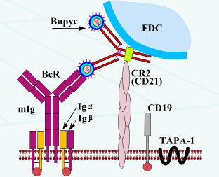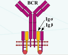 Антигенраспознающий В-клеточный рецептор В-линфоцитов (BcR - англ. В-се11 Receptor) построен из молекулы мембранного иммуноглобулина (mlg, состоящий из двух одинаковых тяжелых Н- и двух одинаковых легких - L-цепеи) и двух молекул CD79 (Igα, Igβ) - BcR имеет трансмембранные и внутрицитоплазматические сегменты, передающие внутриклеточные сигналы. |