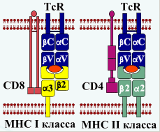 Антигенраспознающий Т-клеточный рецептор Т-лиифоцитов (TcR - англ. Т-се11 Receptor) имеет две формы - αβ и γδ, которые соединены в мембране клетки с комплексом CD3. Димеры αβ и γδ также как молекулы иммуноглобулина, имеют V- и С-домены. TcR совместно с корецепторами CD8 или CD4 распознает комплекс пептид-антиген + МНС первого (I) или второго (II) класса. |