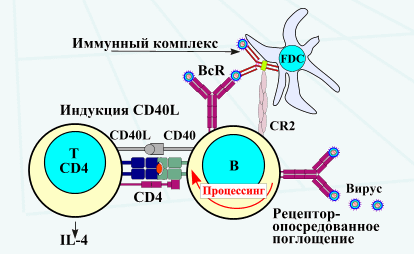 В-лимфоциты дифференцируются в костном мозге (или в бурсе - фабрициевой сумке, находящейся в клоаке птиц). Выполняют роль антигенпрезентирующей клетки (АПК) и, после преобразований (в результате связывания антигена) В-лимфоциты дифференцируются в плазматические клетки, продуцирующие антитела. В-лимфоциты получают антиген от фолликулярных дендритных клеток (FDC), несущих иммунные комплексы антиген-антитело, а также в результате рецептор-опоередованного поглощения.