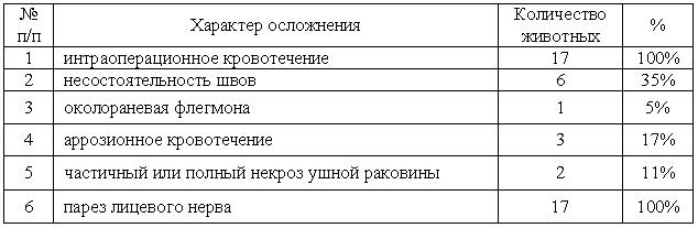 УДК 619:616.228.1:616-089:636.7+636.8 Е.М. Козлов (Ветеринарная клиника "Энималз", г. Новосибирск) ОСЛОЖНЕНИЯ ПРИ ТОТАЛЬНОЙ РЕЗЕКЦИИ НАРУЖНОГО СЛУХОВОГО ПРОХОДА У СОБАК И КОШЕК Показаниями к тотальной резекции наружного слухового прохода у собак и кошек являются заболевания слухового прохода, вышедшие за пределы возможностей консервативной терапии. К таковым заболеваниям относят хронический упорно рецидивирующий отит, стенозы слухового прохода, вызванные гипертрофией церуминозных желез, гипертрофией кожи слухового прохода, кальцификацией хряща слухового прохода, рубцовыми изменениями стенок слухового прохода. Сужение просвета приводит к затруднению и даже полному прекращению оттока экссудата. В таких случаях наблюдают распространение патологического жидкостного отделяемого в среднее ухо, парааурикулярные ткани и мягкие ткани области глотки. При этом могут развиваться чрезвычайно тяжелые осложнения наружного отита: парааурикулярные флегмоны, средний и внутренний отиты, остеомиелит височной кости. Особняком стоят онкологические заболевания: церуминомы и аденокарциномы церуминозных желез, веррукозный отит. Показания к тотальной резекции при перечисленных заболеваниях абсолютные, так как следует учитывать, что органосохраняющие операции сопровождаются упорным рецидивированием болезни, а рецидивирование может приводить к озлокачествлению доброкачественных новообразований и метастазированию злокачественных опухолей. Как правило, процесс метастазирования аденокарцином церуминозных желез развивается поэтапно: вначале обнаруживают метастазы в заглоточных лимфатических узлах, затем в паратрахеальных и предлопаточных лимфатических узлах, и далее - в средостенных лимфатических узлах и легких. Тотальная резекция показана при некоторых формах среднего отита, например, эмпиеме барабанной полости, но в таких случаях оперативный прием завершают латеральной остеотомией стенки барабанной полости. Таким же образом выполняют хирургическое вмешательство при полипах барабанной полости. Количество осложнений при тотальной резекции наружного слухового прохода очень велико, по нашим наблюдениям, осложнения возникают у 100% оперированных больных, причем у многих пациентов имели место сразу несколько разноплановых осложнений (Таблицы 1; 2)