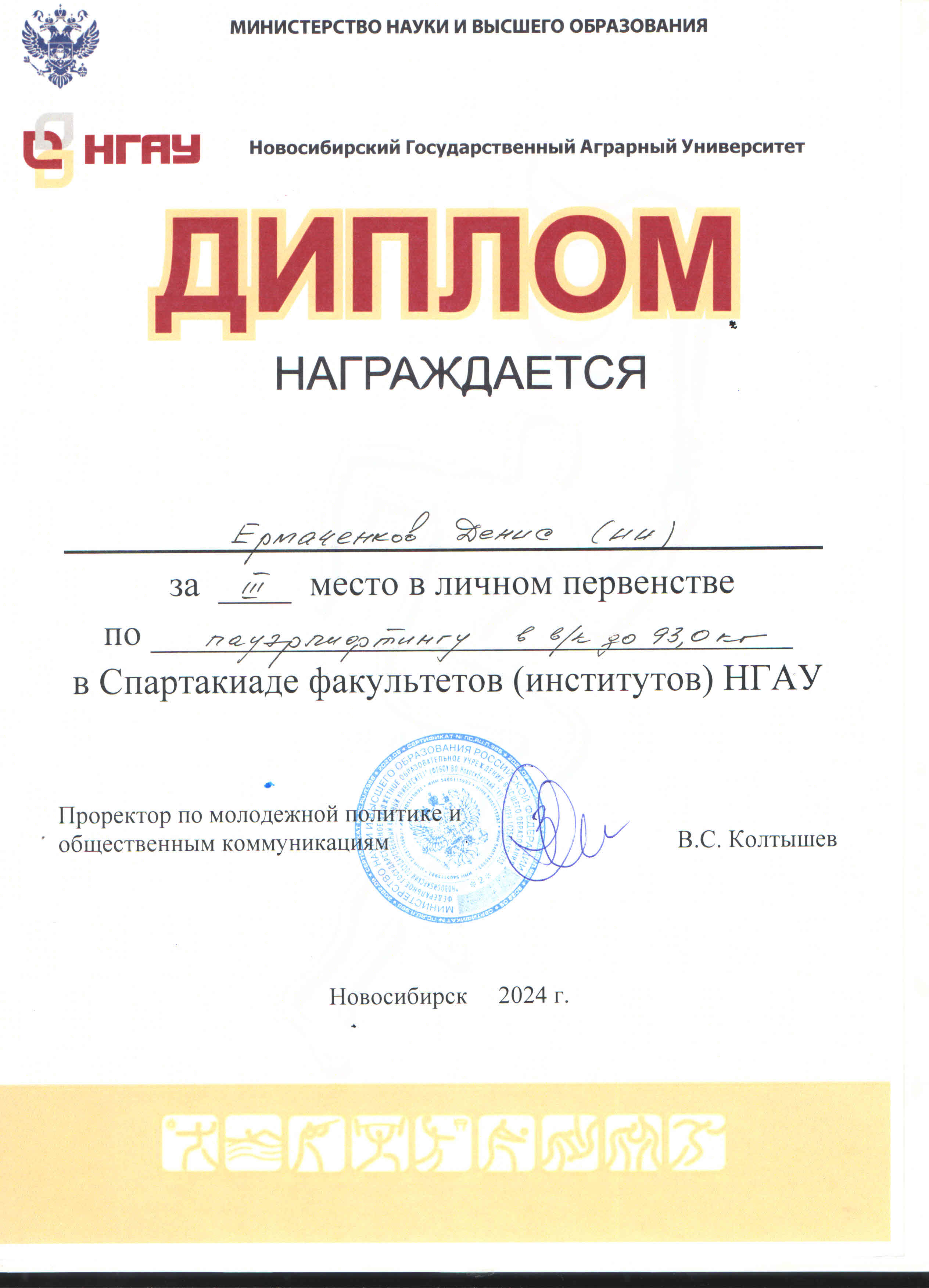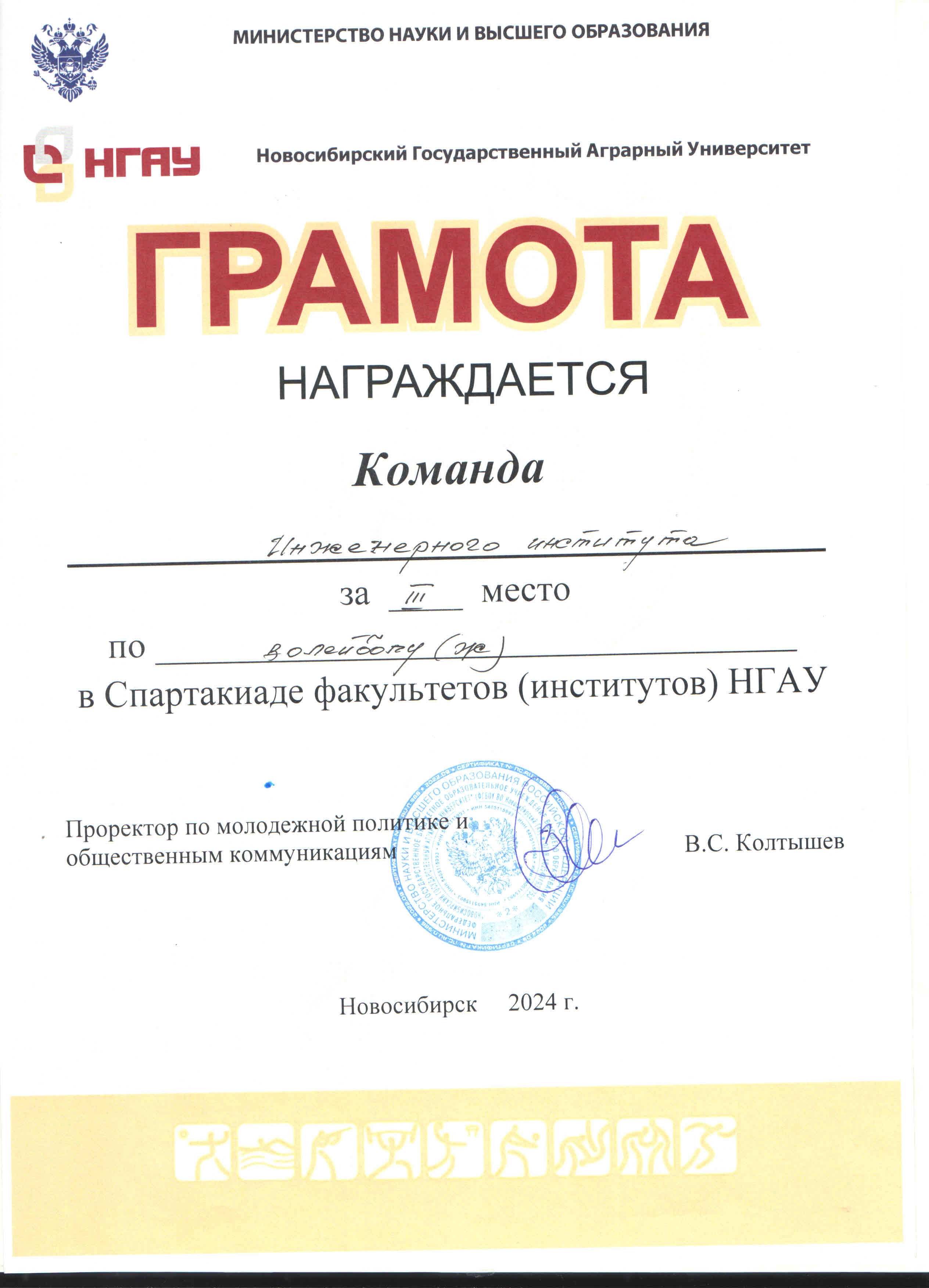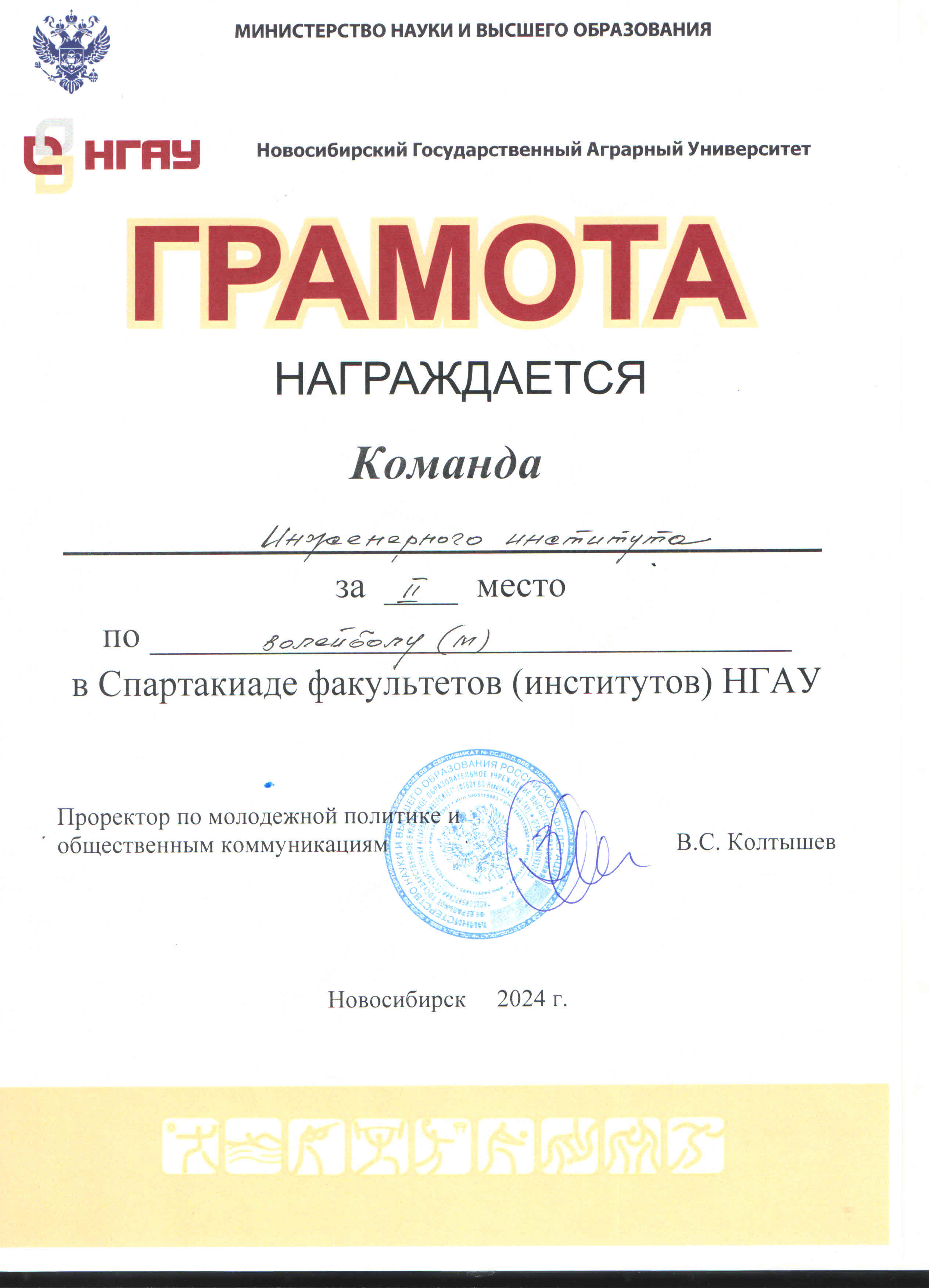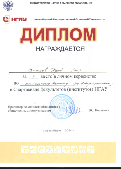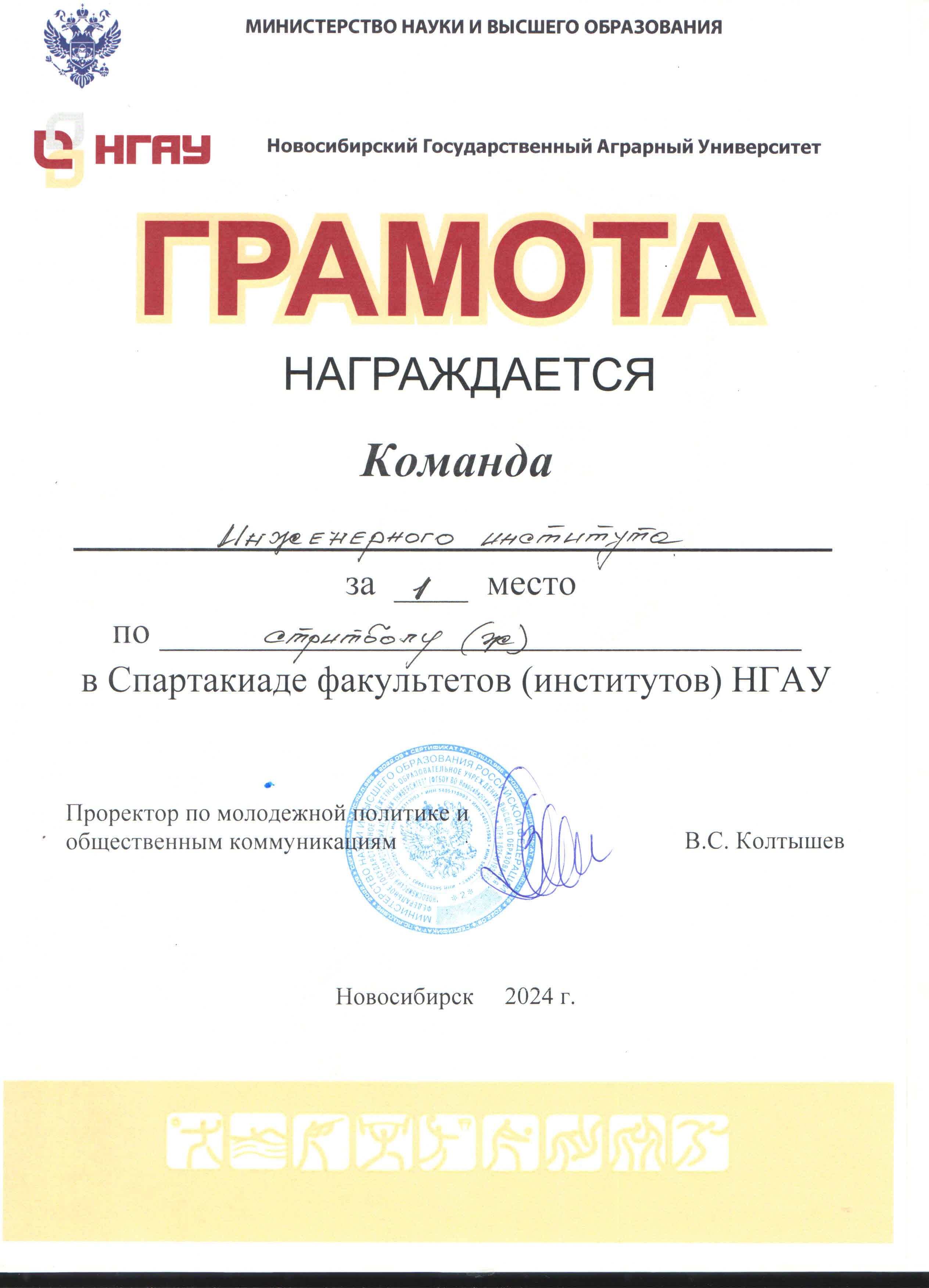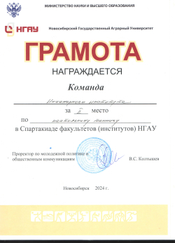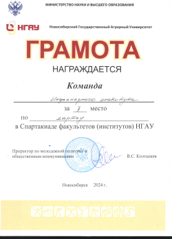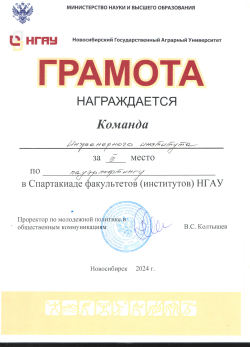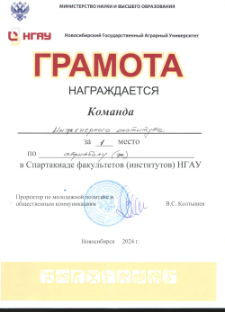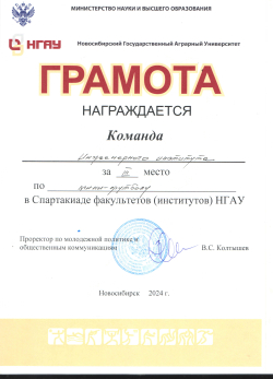 С 15 по 25 апреля в спорткомплексе НГАУ прошла спартакиада среди студентов НГАУ-2024, в которой участвовали команды студентов всех факультетов (институтов) вуза по сем видам спорта. По итогам соревнований спортсмены Инженерного института заняли ПЕРВОЕ место в общекомандном первенстве.