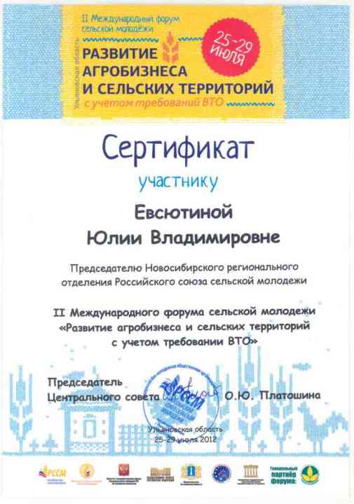В период с 25 по 29 июля 2012 года в Чердаклинском районе Ульяновской области состоялся II Международный форум сельской молодёжи «Развитие агробизнеса и сельских территорий с учётом требований ВТО».