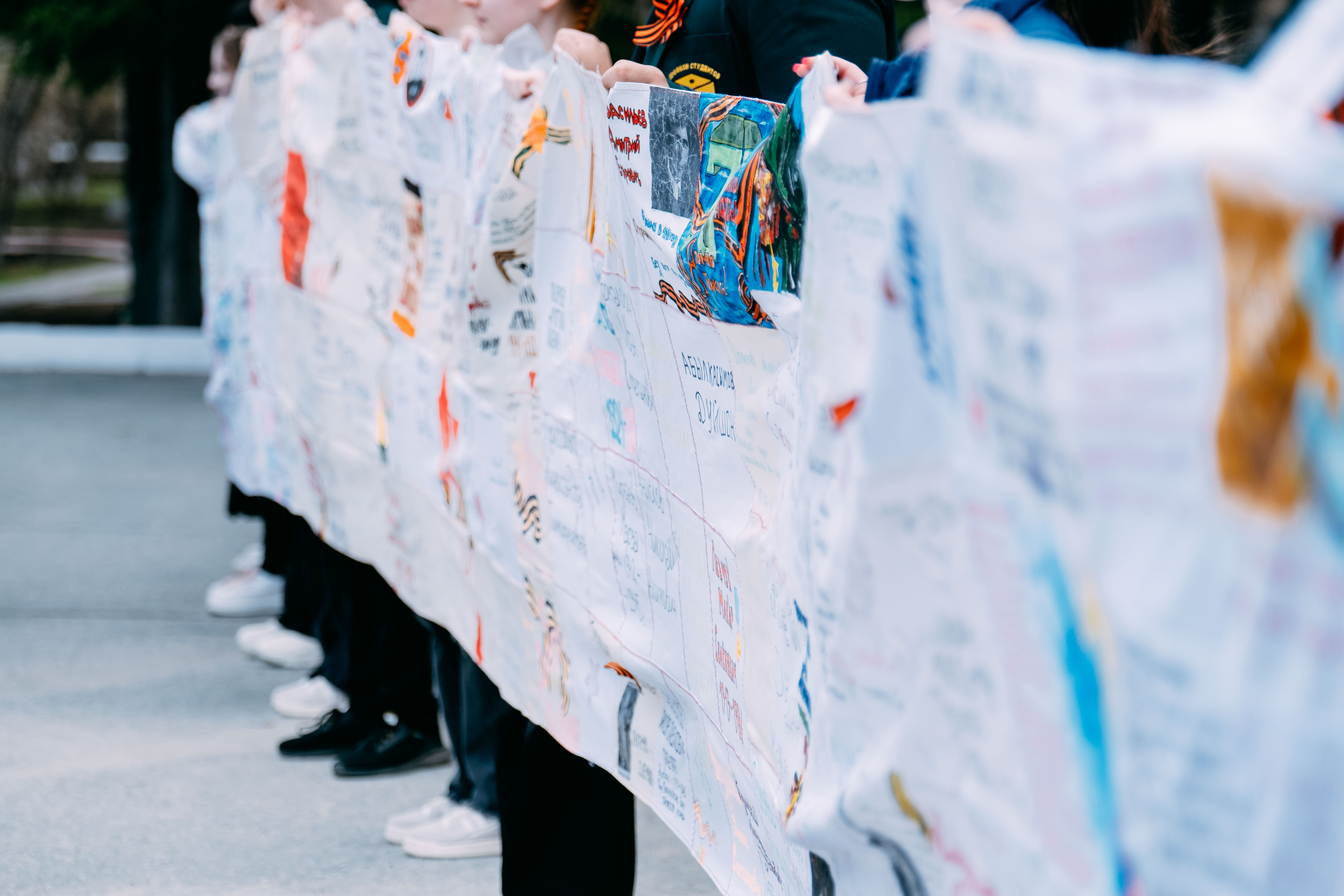 На Главной площади университета продемонстрировали реликвию нашего ВУЗа – платок памяти – полотно, хранящее в себе память о тысячи героях – участниках ВОВ, блокадниках, тружениках тыла, сшитый воедино из маленьких платочков, сделанных руками наших студентов.