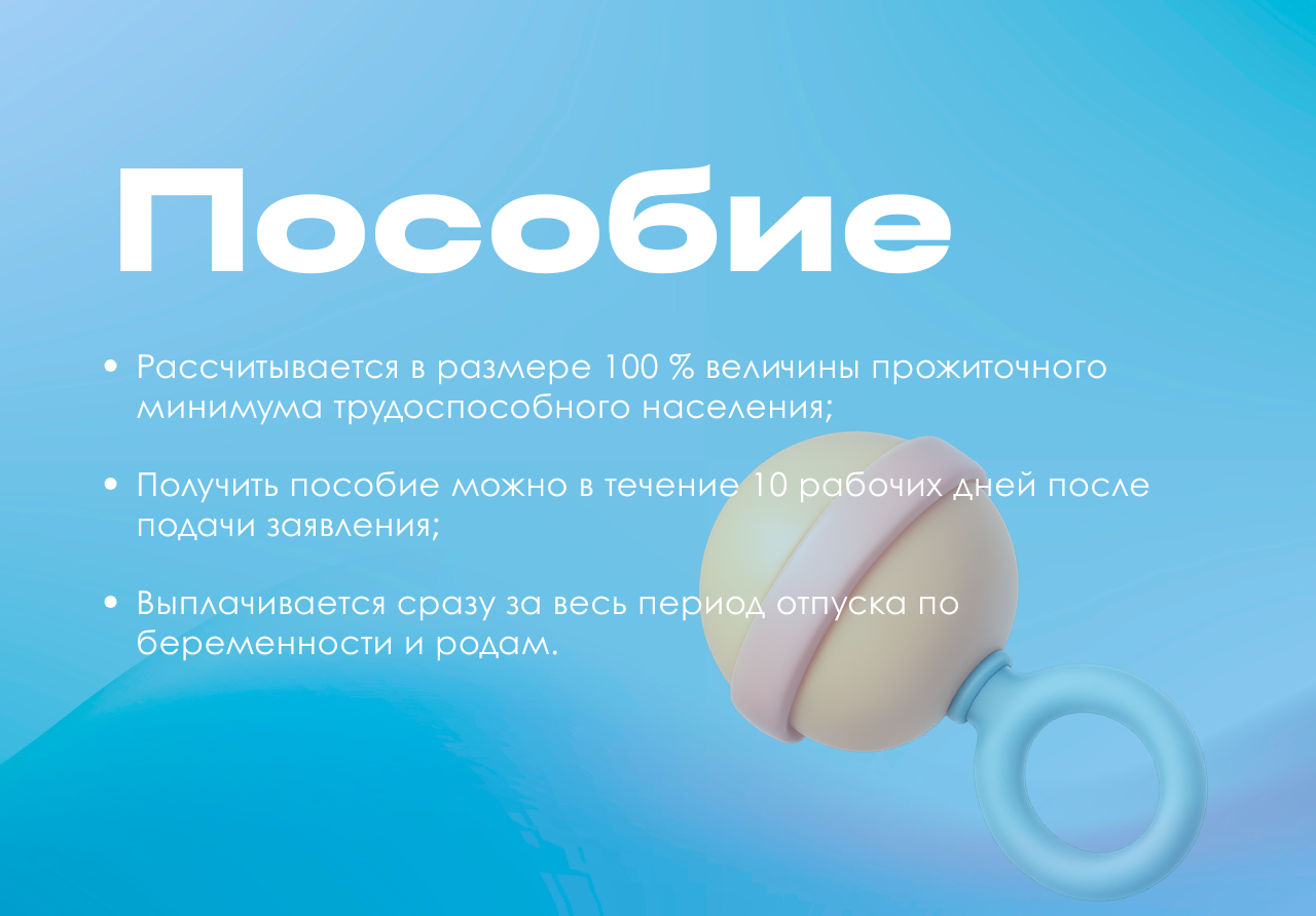 - Пособие рассчитывается в размере 100 % величины прожиточного минимума трудоспособного населения;