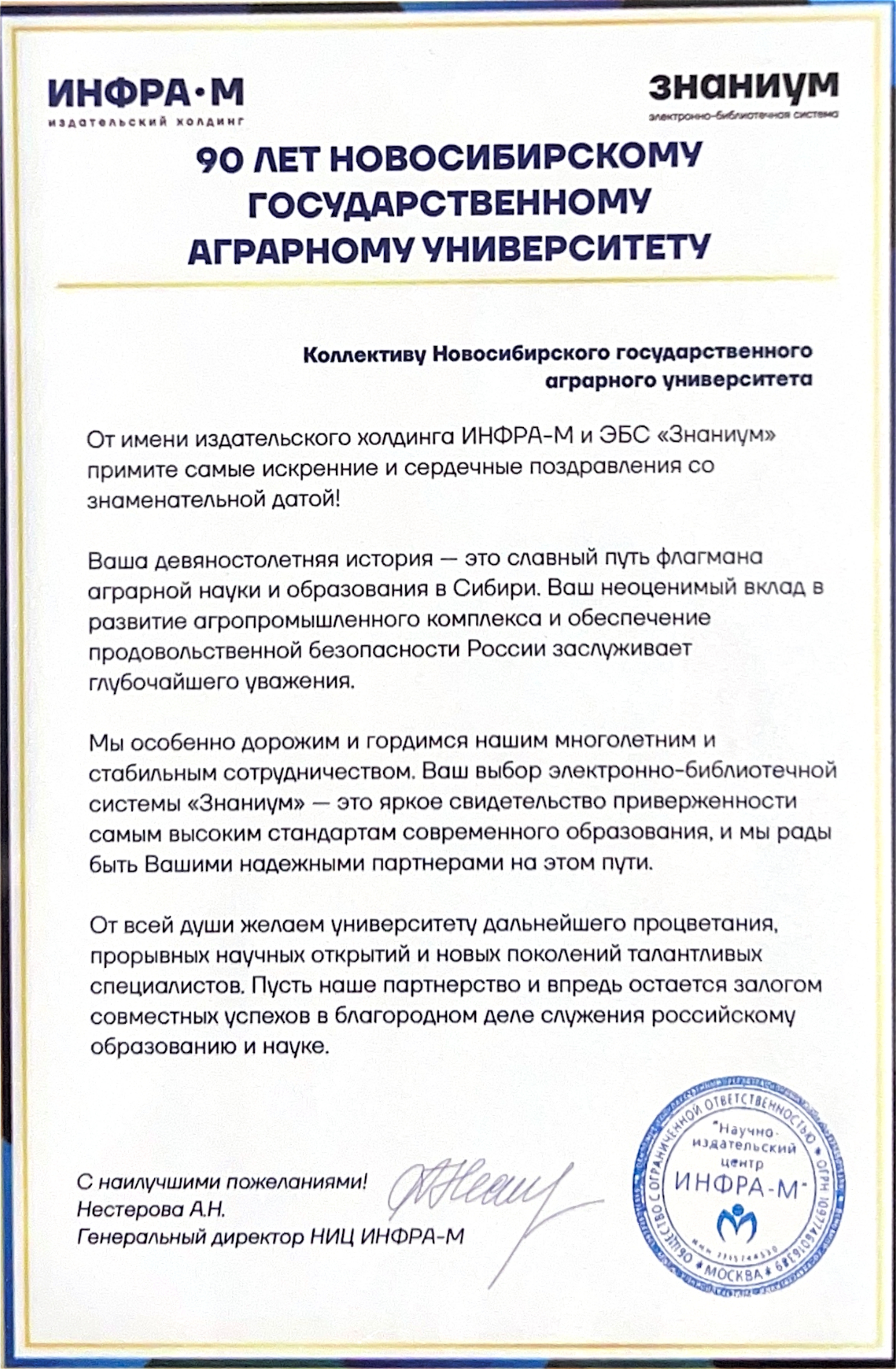 13.11.2025 Генеральный директор Национального издательского центра ИНФРА-М Альбина Нестерова поздравила Новосибирский ГАУ с юбилеем