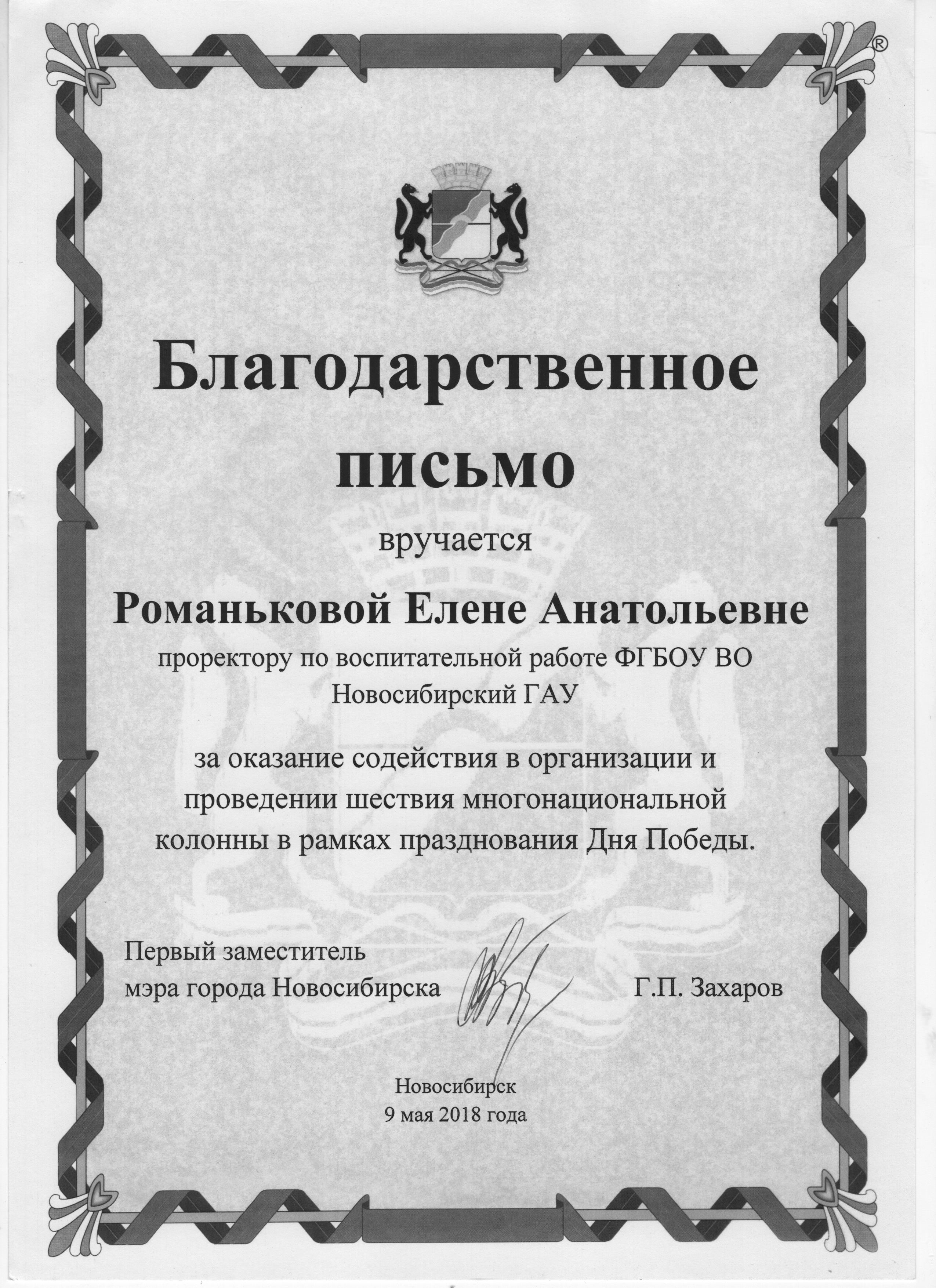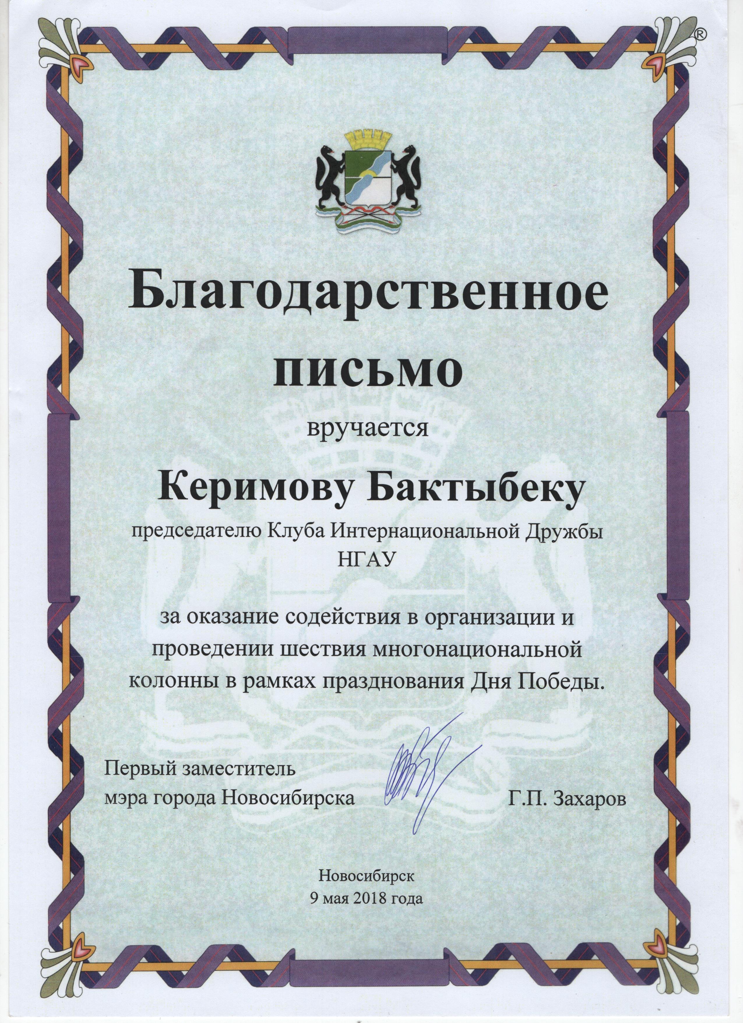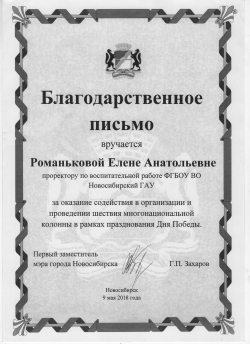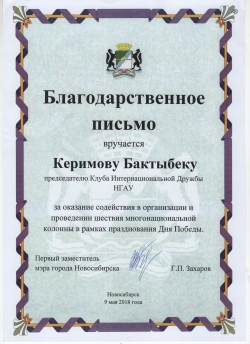 В рамках мероприятия Первый заместитель мэра города Новосибирска Захаров Г.П. вручил благодарственные письма. За оказание содействия в организации и проведении шествия многонациональной колонны в рамках празднования Дня Победы, благодарственными письмами были награждены проректор по ВР НГАУ Романькова Е.А. и председатель Клуба интернациональной дружбы НГАУ Керимов Б.Т.
