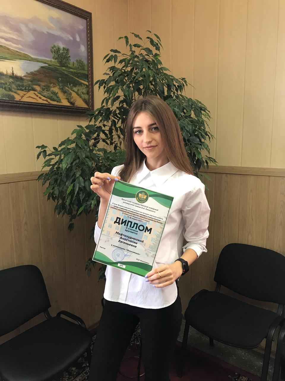 среди студентов, аспирантов и молодых ученых высших учебных заведений Министерства сельского хозяйства России (Сибирский федеральный округ) по номинациям: «Менеджмент», «Экономика» и «Экономические науки». В номинации «Экономика» наш университет представили студенты 4 курса факультета экономики и управления (отделение экономики) Мифтахудинова Анастасия Евгеньевна с темой доклада «Оценка финансовой устойчивости муниципального образования» (науч. рук. канд. экон. наук И.О. Утешева) и Гладких Екатерина Алексеевна на тему: «Оценка уровня обеспеченности и эффективности использования основных фондов (на материалах Новосибирской области)» (науч. рук. канд. экон. наук, доцент Г.В. Исаева). В результате диплом II степени в номинации «Экономика» был присужден Мифтахудиновой Анастасии Евгеньевне. Мы поздравляем участников конкурса и их научных руководителей с высокими результатами работы и желаем дальнейших успехов!