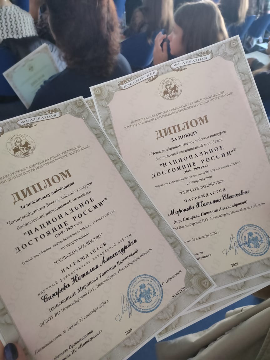 Победители заочного тура были приглашены на очный финальный тур в Москву, который проходил 22 и 23 сентября 2020г. Миронова Татьяна и Бобикова Анна (сейчас уже аспирантка Новосибирского ГАУ) стали победителями в секции «Биология, сельскохозяйственные науки, химия, экология». Им вручены дипломы победителей, памятные медали, благодарственные письма научному руководителю победителей и ректору.
