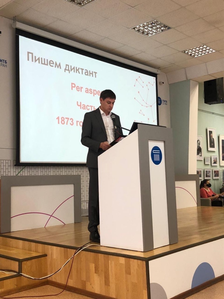 Ректор Новосибирского ГАУ Евгений Рудой принял участие в «Тотальном диктанте-2020», где читал текст авторства Андрея Геласимова в главной библиотеке города - Государственной публичной научно-технической библиотеке Сибирского отделения Российской академии наук.