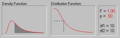 На приведенном выше рисунке показаны различные значения вероятностей (p-значения) для F-распределения с обеими степенями свободы равными 10.